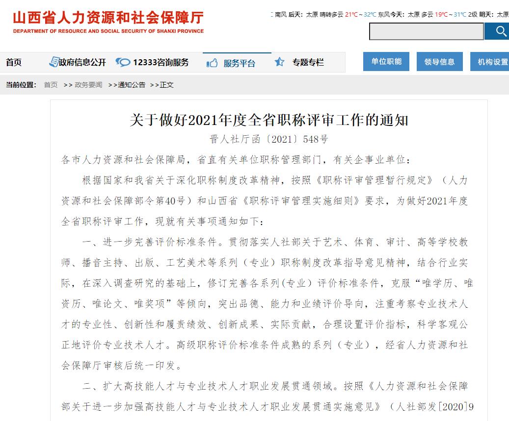 關(guān)于做好2021年度全省職稱(chēng)評(píng)審工作的通知 晉人社廳函〔2021〕548號(hào)